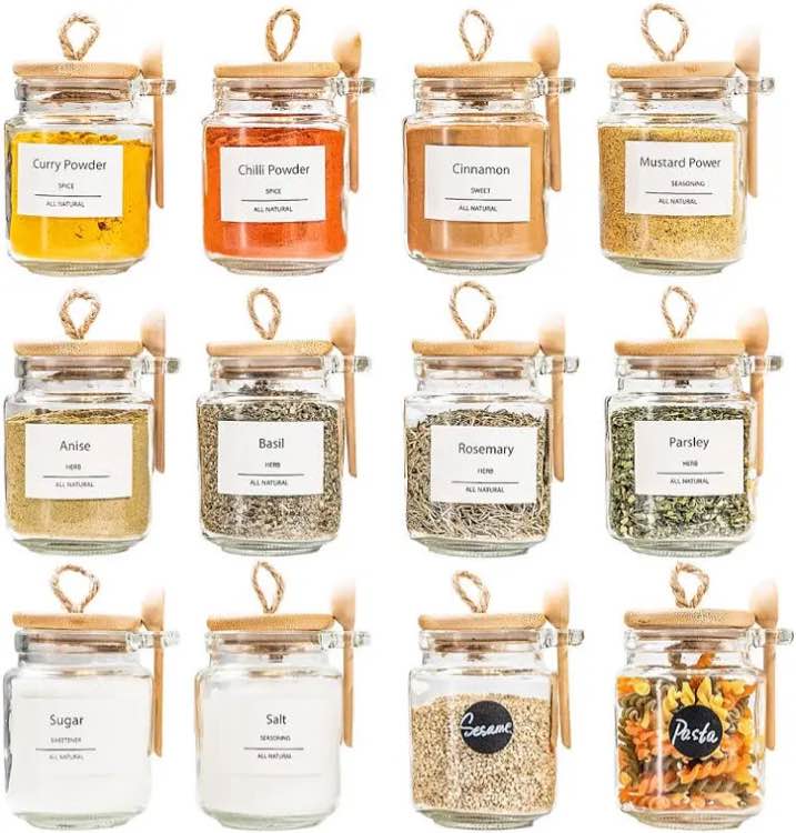 12 pcs glass spice jars with bamboo airtight lids & 201 labels - 8oz small empty food storage containers for kitchen, seasonings, herbs, salt circular