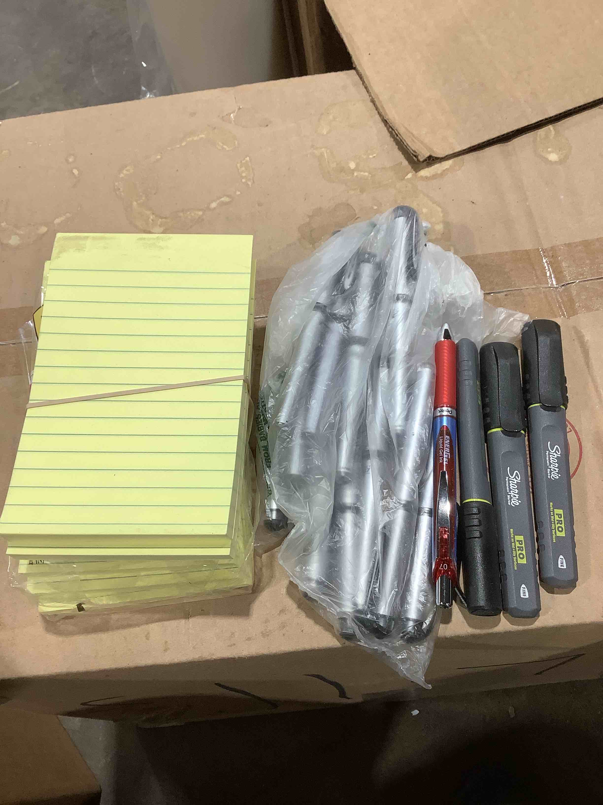 assorted office supplies: paper mate, 60 pens, ring book 3 inch hoops, notepads, correction fluid, hammer mill blue paper