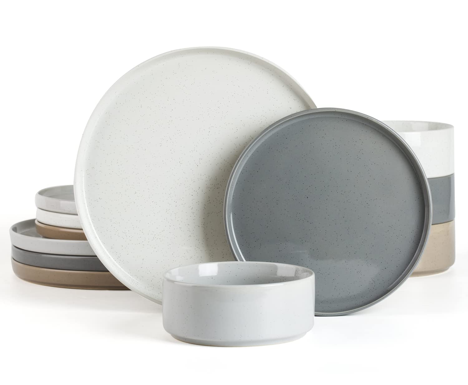 Famiware Saturn 16 Pieces Plates and Double Bowls Sets for 4, Stoneware Dinnerware Set with Pasta Bowl, Dish Set with Trim - Chip & Scratch Resistant, Microwave & Dishwasher Safe, Light Gray