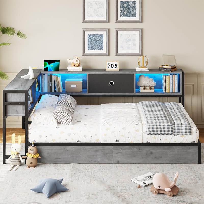 white plywood frame queen size upholstered platform bed with lift-up storage supported by metal and wooden slats ( incomplete one box only)