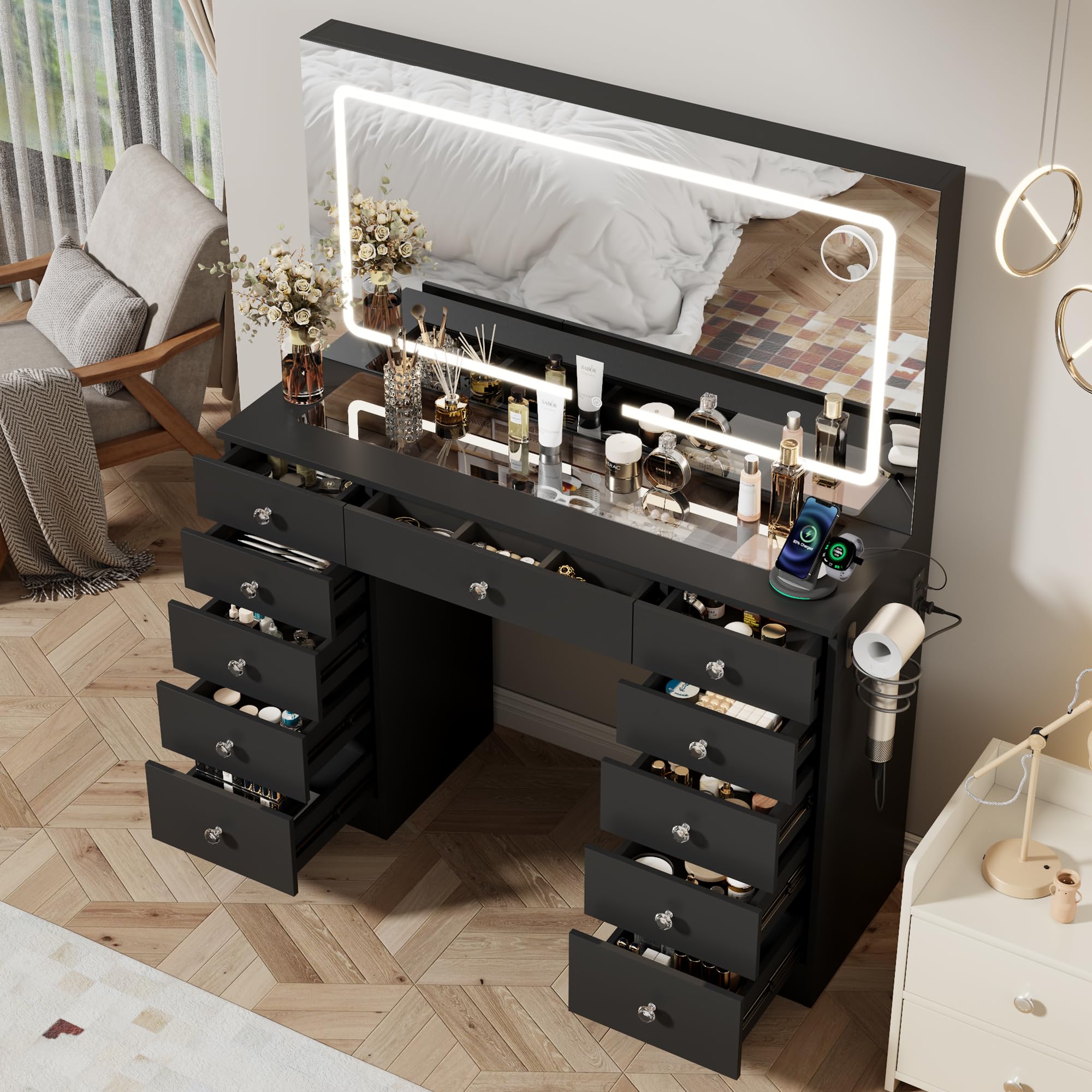 SADENICEL King Size Bed Frame with Storage Headboard, Metal Platform Bed Frame King with 4 Drawer, LED Light, Charging Station, No Box Spring Needed, Noise Free, Easy Assembly, Grey