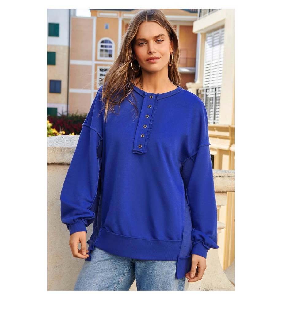 SHEWIN Sweatshirts Women Oversized Pullover Tops Plus Size Long Sleeve Button Henley Neck Sweatshirts for Women Patchwork Shirts Apricot size M