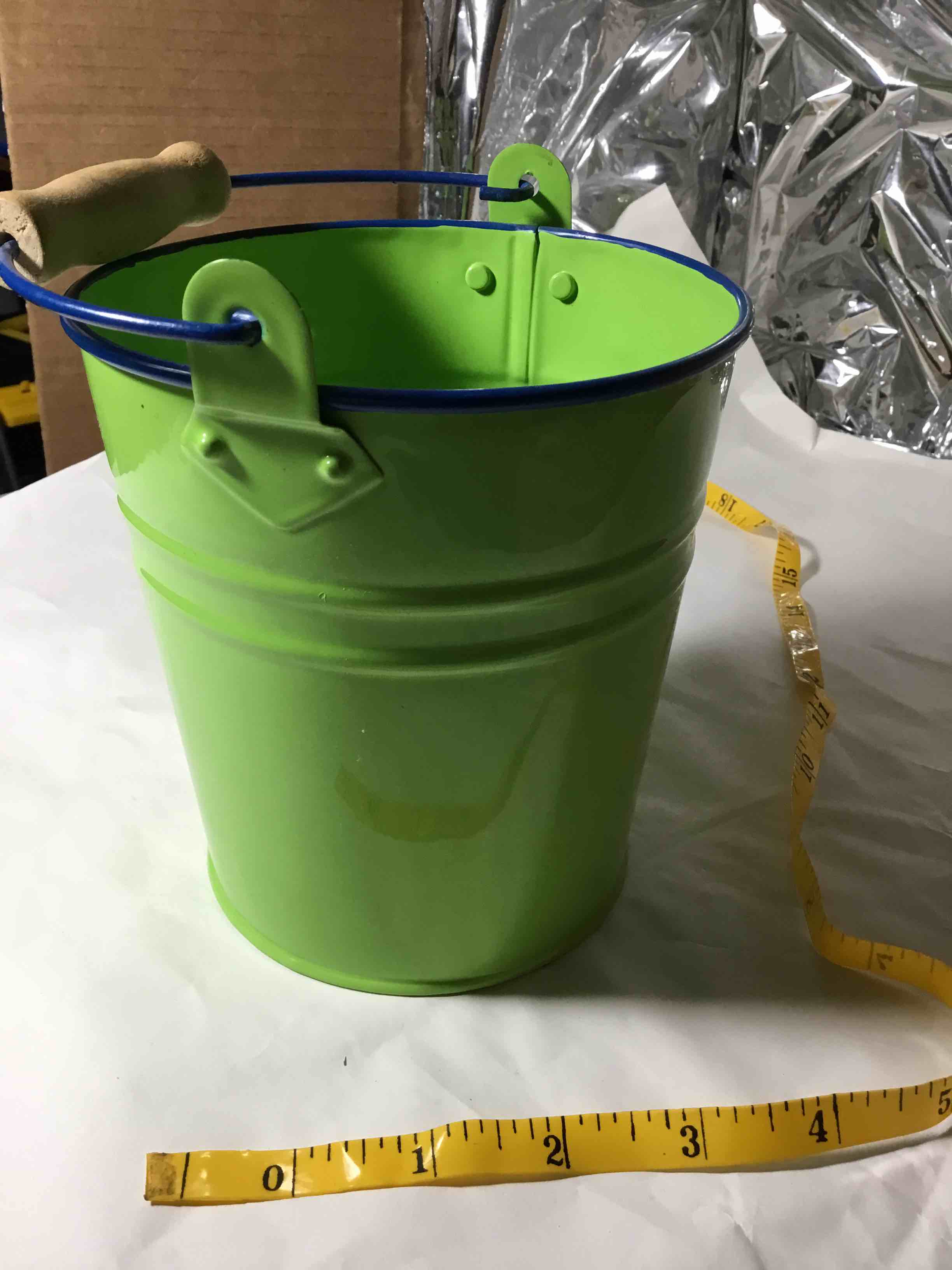 Small green metal tin pail with a wooden handle grip