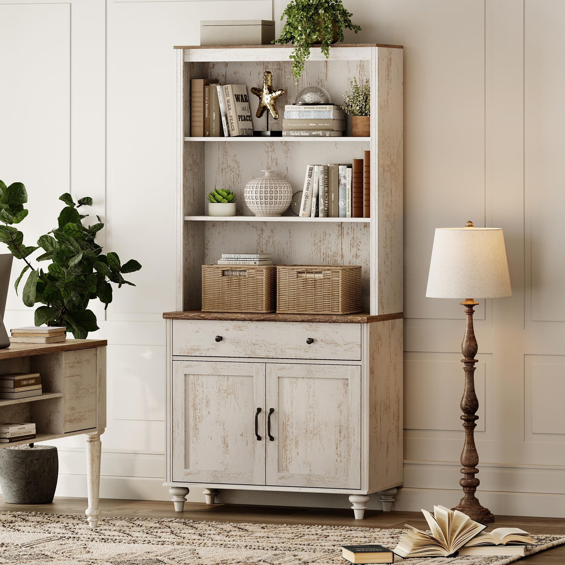 WAMPAT 72" Tall Bookcase Large Display Book Case Shelf with 3-Tier Open Book Shelfs, 3 Tier Farmhouse Bookshelf with 3 Drawers, Library Wood Bookshelves for Living Room or Study Room or Bedroom, White